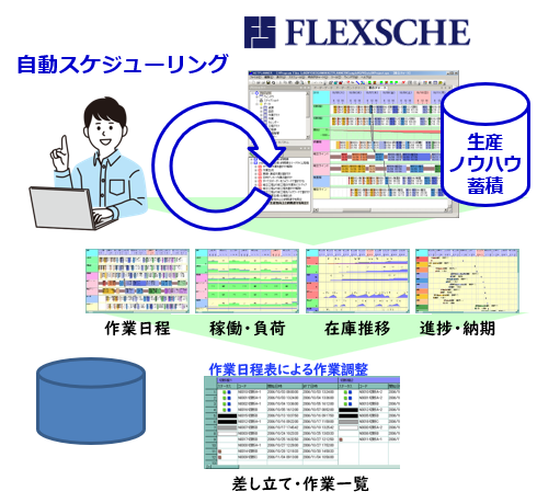 FLEXSCHE:生産スケジューラ FLEXSCHEは『使いやすさ』『柔軟性』『スケジューリングロジック』に優れた新世代の生産スケジューラです。 汎用スケジューラとしては、業界トップクラスの性能と実績を誇るパッケージ製品です。